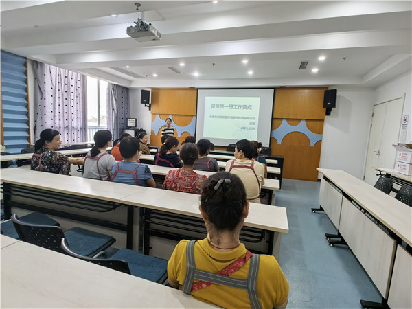首先,组织全体保育员、保洁和保健老师集中研修室,对保育工作进行了专业的培训指导。培训中不仅巩固了消毒操作的规范性,日常工作的规范性。同时也提高了保育员自身的技能,提高了幼儿园保育工作的质量。