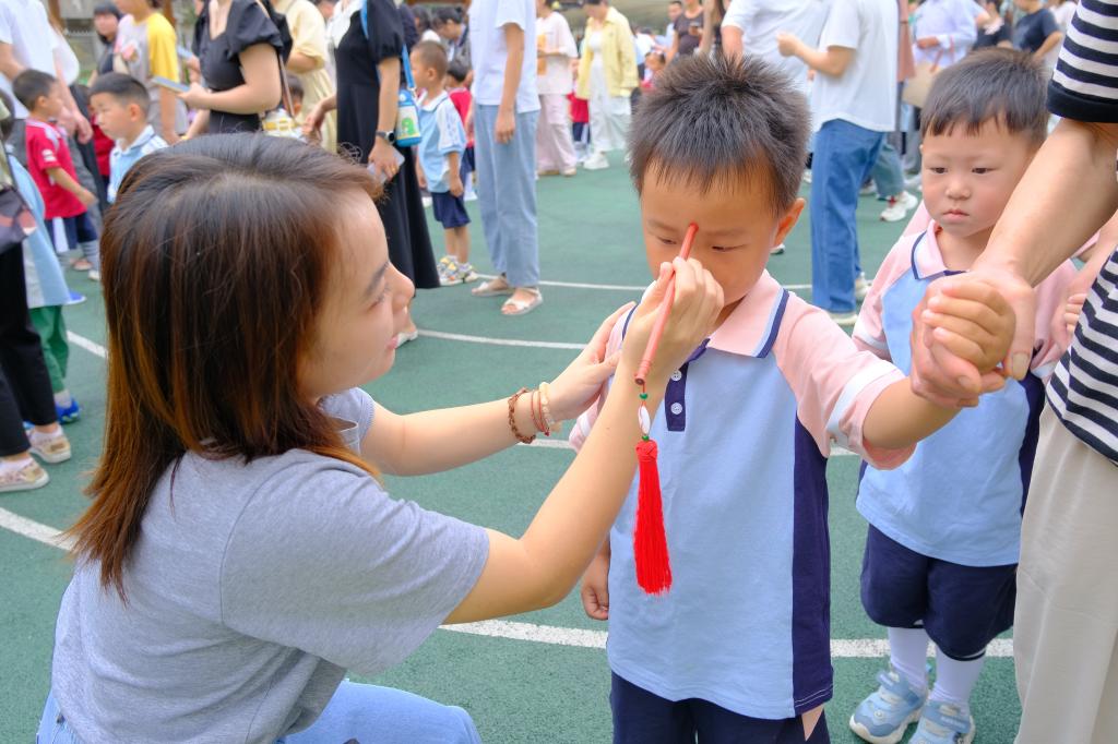 伴随着悠扬的礼乐声,入园礼正式开启。孩子们身着整洁的服装,小手牵着爸爸妈妈的手,沿着铺展的红色地毯缓缓前行,有序穿过成长门。随后,孩子们来到 “摸意头” 环节。桌上整齐摆放着寓意美好的物品,在教师的耐心引导下,孩子们伸出小手轻轻触摸心仪的物品,家长们则在一旁轻声说着对孩子的祝福。“朱砂启智” 环节,教师们手持蘸有朱砂的毛笔,温柔地在每个孩子的眉心点上一颗鲜红的 “朱砂痣”。“痣” 通 “智”,这一传统仪式不仅为孩子们的额头添了一抹亮色,更寄托着 “开启智慧、目明心亮” 的美好愿望。紧接着是庄重的 “行拜师礼”。孩子们双手交叠放于胸前,向老师们深深鞠躬,稚嫩的动作里满是认真,教师们也弯腰回礼,接过这份来自孩子的信任与尊敬,现场氛围既温馨又庄重,让孩子们在仪式感中学会感恩与尊重。入园礼的最后,全体师生及家长整齐列队,面向国旗肃立。伴随着雄壮的《义勇军进行曲》,五星红旗缓缓升起,孩子们虽懵懂,却也学着大人的模样挺直小身板,目光追随着国旗直至顶端。这一刻,爱国的种子悄然在孩子们心中生根发芽,也为这场充满意义的入园礼画上了圆满的句号。