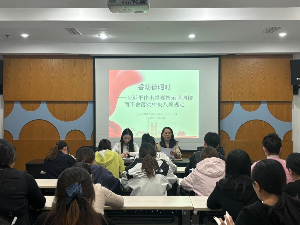 2025年10月20日,为深入贯彻落实习近平总书记关于作风建设的重要指示精神,太仓市高新区镇洋幼教中心香花幼儿园开展“习近平作出重要指示强调锲而不舍落实中央八项规定”师德学习活动,由高文琴老师主持。