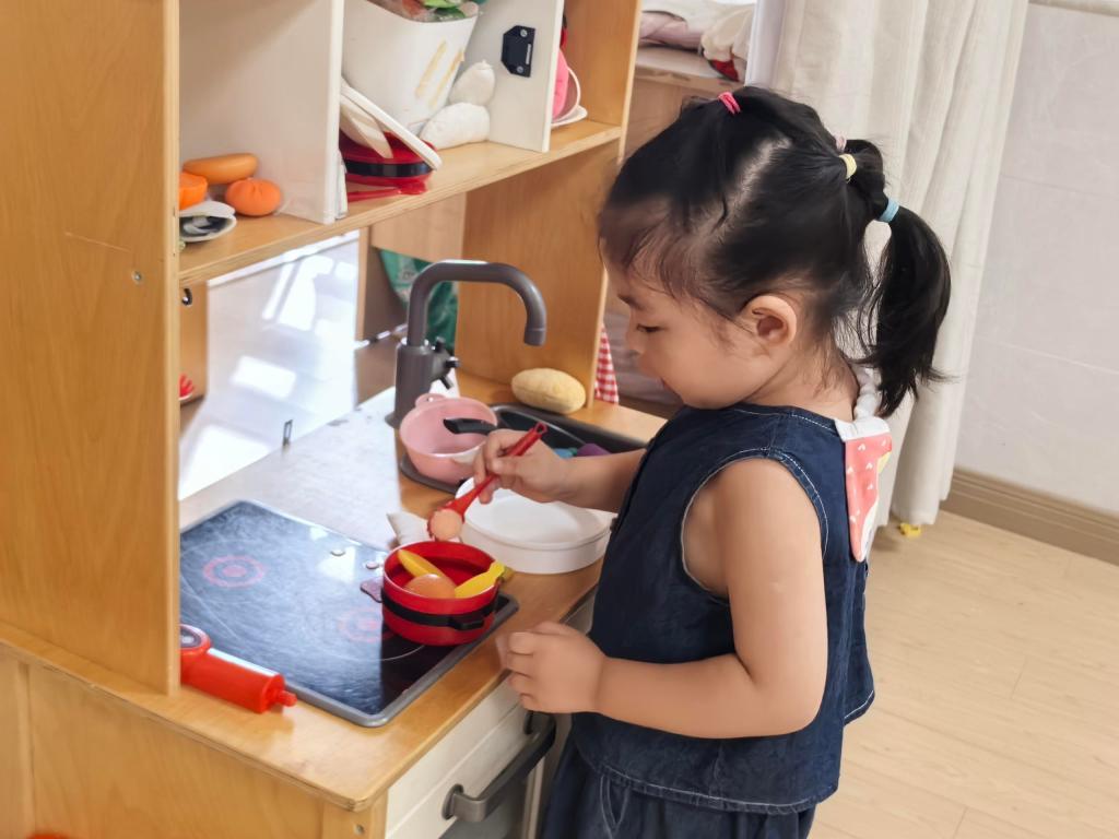 区域游戏开始后,嘟嘟选择了厨房角色区。她首先走到玩具灶台前,将红色“锅具”放在灶台上,从旁边的食材架上取下黄色仿真蔬菜和粉色仿真食材,一一放入锅中。接着,她拿起红色小勺子,认真地在锅里“搅拌”,嘴里小声念叨:“煮一煮,马上就好啦。”期间,她偶尔会抬头看看周围,然后继续专注于手中的“烹饪”动作。当“搅拌”了一会儿后,她又将锅具轻轻移动了一下位置,仿佛在模拟真实厨房中调整锅具的操作,随后拿起旁边的白色盖子,尝试盖在锅上,嘴里说着:“盖好盖子,煮得更快哦。”