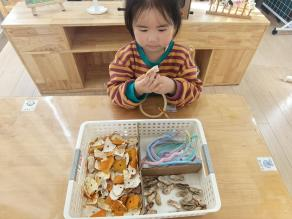 晨晨坐在桌前,先拿起篮子里的橘子皮,用手指触摸其纹理;接着拿起毛根(彩色扭扭棒),尝试弯折成圆环,反复调整手环的大小。幼儿将橘子皮碎片轻轻缠在毛根上,动作略显笨拙但专注——先捏紧橘子皮一端,慢慢绕在毛根外侧,过程中橘子皮掉落2次,她会立刻捡回重新固定,最终完成一个“橘子皮毛根手环”。晨晨拿着做好的手环,走到金属网格架前,用小夹子将手环与其他作品一起夹在架子上,还侧身观察同伴的作品,露出微笑。