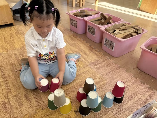 瑶瑶在建构区中选择了用一次性纸杯进行搭建,瑶瑶在地面上一个一个的摆上纸杯,摆了5个纸杯。在往上搭建第二层的时候,瑶瑶发现杯子底和底叠在一起会倒塌,于是他将第二层的杯子倒扣在第一层的两个杯子间,放置第三层的时候,瑶瑶依然像搭建第二层一样,但是由于杯子之间距离太宽了,杯子墙倒塌了,于是瑶瑶将倒塌的纸杯捡起来重复搭建杯子墙。