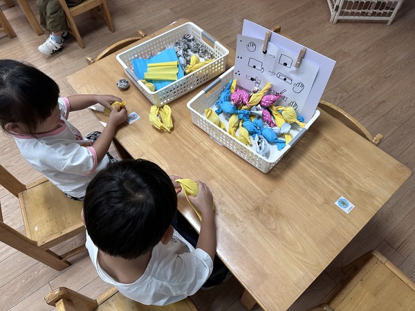 哲哲来到美工区,他指着新投放的材料问道:“老师,这个怎么玩的呀?”我走过去示范了做糖果的方法:将废纸揉成一个小团,然后包在彩纸中卷起来,再在两边拧一下。哲哲看完后拿起一片废纸,将废纸捏在手里攥了几下。“这里怎么突出来的,不是圆的?”他又用两个手指把废纸团捏得更小了一些,然后从篮子里选了一张橘色的纸,将纸团放在橘色纸中间。随后,他用彩纸将废纸团包起来,放在盘子里。“我的糖旁边怎么露出来了呀?”他想了想,说道:“我忘记两边要拧一拧了。“说完,他在“糖果”的两边拧了一下,我注意到彩纸的一端有些坏了。《指南》在健康领域中提到:创造条件和机会,促进幼儿手的动作灵活协调。美工区制作糖果的这一活动运用到了揉、卷、拧等动作,对于锻炼幼儿手部的精细动作有所帮助。但是小班幼儿的动作发展还不是特别好,在操作过程中,对于方法和力度的把握还会存在一些问题,包糖果的纸容易破损。教师可以提供更丰富的材料,如玻璃纸、毛球等等,让幼儿根据自己的能力选用合适的材料制作糖果,在操作的过程中帮助锻炼手部的肌肉。在美工区中,教师也可以提供丰富工具和材料,或充分利用各种自然、废旧材料和常见物品,让幼儿进行画、剪、折、粘等美工活动,促进幼儿手的动作灵活协调