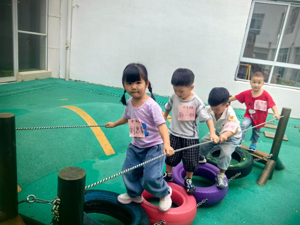 幼儿园真好玩,我也交到了好朋友,我们一起玩了轮胎独木桥