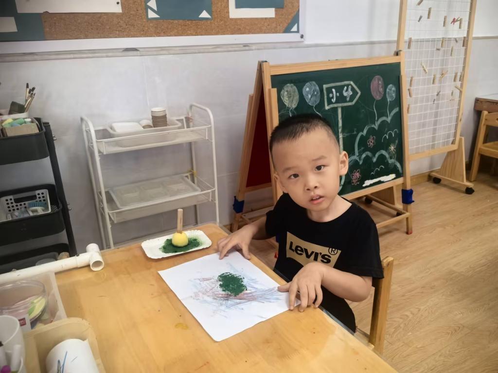 当老师询问他在画什么时,他抬起头,认真地说:“我画的是一片大森林,这些都是大树。”说完,又继续投入到创作中,还自言自语道:“大树要有高有低才好看。”于是,他开始调整按压的位置,有的印章按得高一些,有的按得低一些。