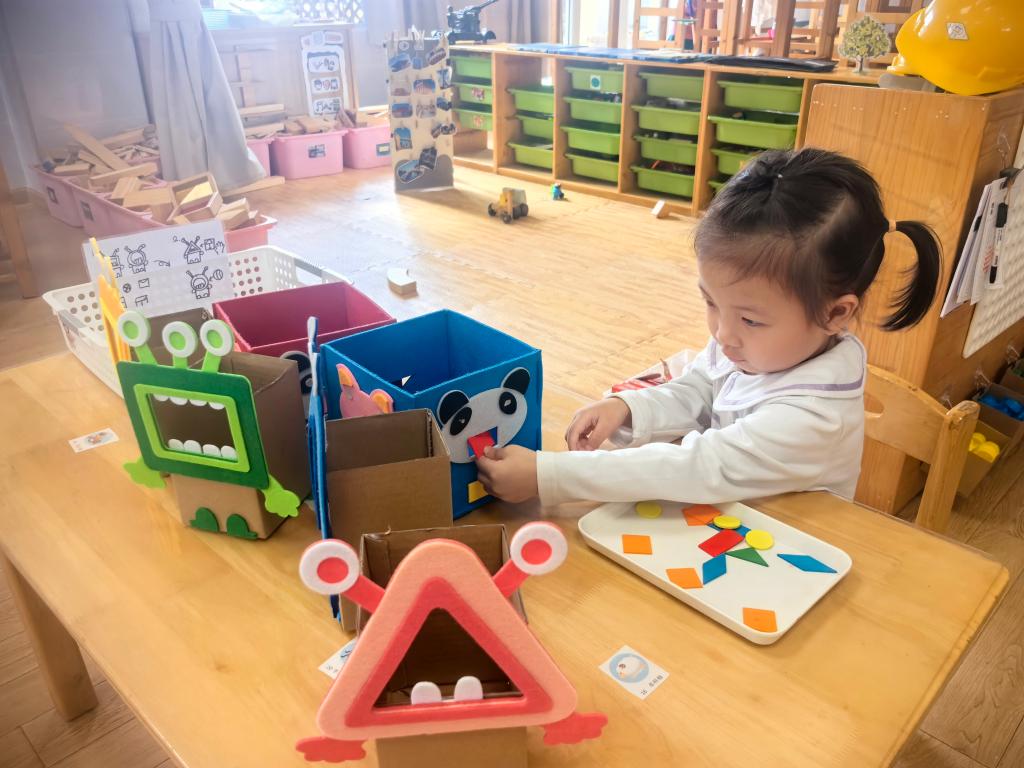 完成3个盒子的“喂食”后,幼儿并未离开,而是将盒中的卡片全部倒出,重新排序。她先将所有圆形卡片挑出,依次放入粉色怪兽的圆形“嘴巴”;再挑出正方形卡片放入熊猫盒;最后处理三角形卡片。当遇到一张橙色长方形卡片时,她尝试放入所有“嘴巴”,发现均不匹配,便将其放在托盘边缘,继续专注于其他形状的匹配,重复操作了3次,始终保持高度投入。