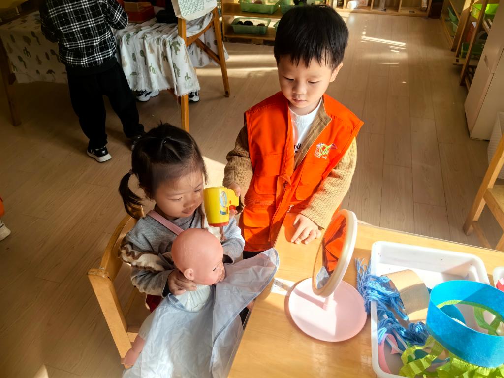 梓瑜抱着布偶娃娃(取名“朵朵”),从娃娃家区域走向理发店区域,边走边轻轻拍娃娃的肩膀:“朵朵乖,妈妈带你剪头发,剪完头发变漂亮哦~”到达理发店后,理发师航航拉过椅子,小心地将娃娃放在椅子上,拿起桌上的浅蓝色塑料布,从娃娃脖子处绕了两圈,打了个松散的结,嘴里嘟囔:“围好布哦,不然头发会掉身上的。”航航将梳子轻轻搭在娃娃的头顶,做出“梳头发”的动作,梳了3下后,拿起软管对着娃娃头发的方向,手指假装按了一下按钮),嘴里发出“滋滋滋”的声音:“先洗个头”接着他拿起玩具吹风机,给宝宝吹头发,梓榆妈妈用手轻轻扶住娃娃的脑袋,防止娃娃“歪倒”,还时不时用另一只手帮娃娃理了理围布的边角:“宝宝别动哦,马上就好了。”