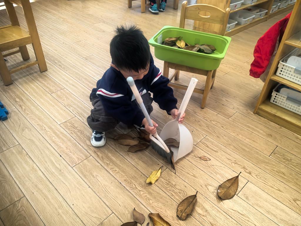 区域活动时岩岩主动选择了“扫落叶”材料(小扫帚、小簸箕、仿真落叶)。他先蹲在地板旁,用右手握住扫帚柄,尝试将散落的落叶往簸箕方向扫,但因力度控制不稳,落叶总“跑开”。几次尝试后,他调整姿势:双腿分开蹲稳,左手扶住簸箕边缘凑近落叶,右手轻轻小幅度扫动,成功把2片落叶扫进簸箕,随即抬头露出笑容。之后他重复这个动作,还主动将簸箕里的落叶倒进旁边的绿色收纳盒,持续专注活动约8分钟。