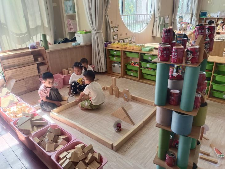 区域游戏开始了,燊燊和泽霖选择了区域游戏,燊燊说我们今天搭什么呢?霖霖说:我们搭奶场吧!燊燊说:搭什么奶场啊!那是农场。农场里有很多小动物,还有奶牛。我们先用长积木围起来,燊燊又用了一个三角形的放在中间说:这个假装是小山吧!对了,我们还要搭一个房顶,如果下雨了怎么办。霖霖说:我来搭一个大门,说着就用一个大的U形积木叠加一个三角形积木,看!我的大门搭好了。