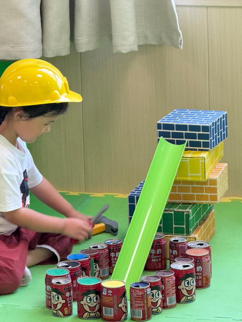 希希找到了一顶黄色的安全帽,她选择坐到角落里,看了看上一次小朋友游戏后留下来的积木堆,希希在一边翻找到了一个塑料管道,她尝试将塑料管道放置在积木堆上,但每次都滑落了下来。希希发现了旁边的小朋友正在翻找角落的旺仔牛奶罐,希希拿了2个牛奶罐来,将牛奶罐靠在了滑落管道的角落,成功将管道竖起在积木上,接着希希拿来了更多的旺仔牛奶罐,将滑滑梯的口围绕了起来。之后希希选择拿起一边的锤子和螺丝刀,开始敲敲打打。