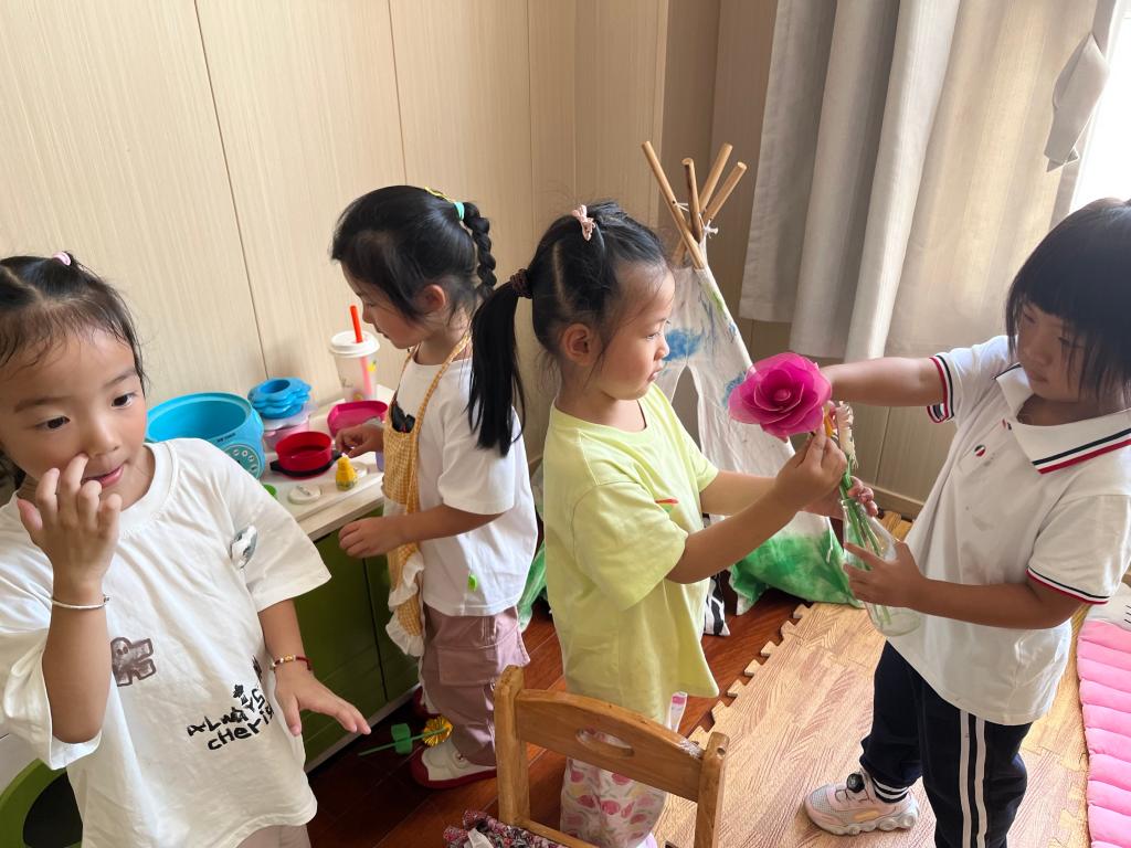 角色游戏开始了,希希穿上了围裙,说到:“我来烧饭吧!”接着她和同伴说道:“锅在哪里呢?”在一通翻找之后,希希在柜子另一侧寻找到了锅碗瓢盆,接着希希说:“我来煮菜。”接着,同伴从一旁的花店里买来了一朵小花,希希便说到:“花可以放在桌子上,我们去找个瓶子吧!”希希在煮完菜后,放在了娃娃家的桌子上,并拿来了一杯奶茶,说:“请吃吧!”