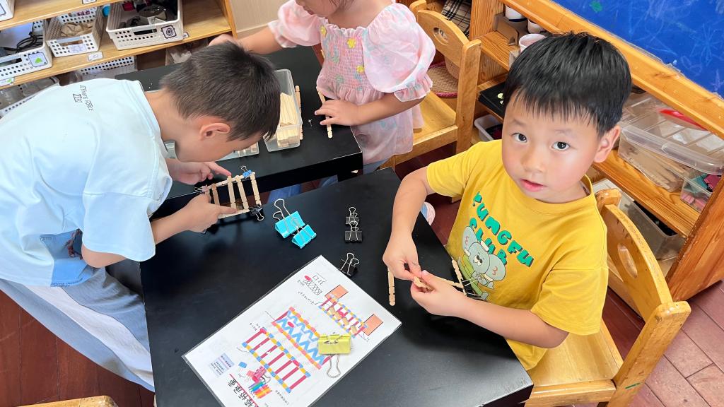 接着,两个孩子开始尝试增加桥的承重,沐沐提议:“我们再加几片积木,看看桥会不会塌。”赫赫点头同意,他们一起轻手轻脚地把积木放置在桥面上。桥在摇摇欲坠中坚持了下来,两个孩子兴奋地拍手庆祝:“看,我们的桥可以承重!”他们随即开始记录下这个重要的发现。