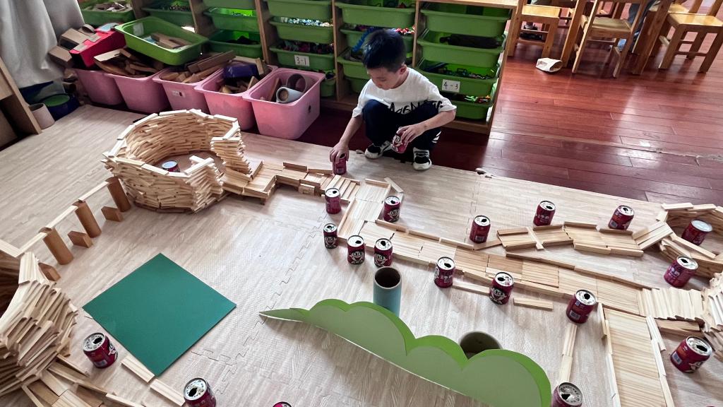 他们默契地分工合作,小烁负责搭建城墙,而禾禾则忙着用牛奶罐制作红旗。禾禾小心翼翼地将牛奶罐涂上鲜艳的红色,并在每个罐子上贴上自制的五角星,仿佛在为长城插上鲜艳的旗帜。小烁则专注地将卡普乐积木一块块搭建起来,他的眉头时而紧皱,时而舒展,显然是在思考如何让长城更加稳固和壮观。
