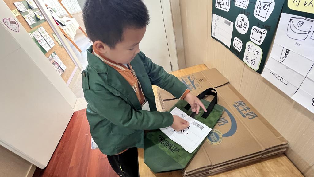 辰辰穿戴着快递员的黄色马甲,认真扮演打包员的角色。他的面前是一个小桌子上放着数个快递包裹和包装材料。观察时,辰辰正专注地用透明胶带将一个小盒子反复缠绕,确保它不会在运输过程中打开。他边做边说:“这个需要小心包装,里面有易碎品。”随后,他拿起快递单,模仿成人般沉稳的语气对“顾客”说着:“您的包裹,我已打包好,请在这里签收。”在整个打包过程中,辰辰始终维持着角色的身份和责任心。