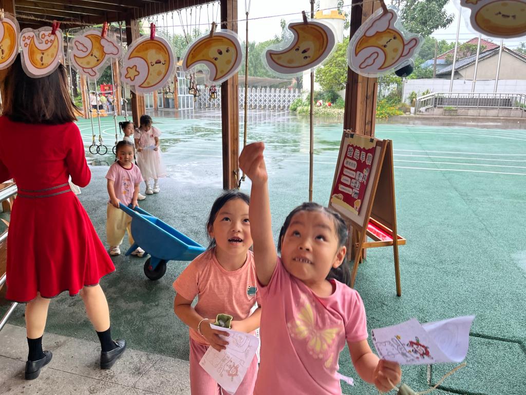 “摘月亮”等趣味游戏,并穿插了制作中秋香包、猜灯谜等传统习俗体验,现场气氛热烈,“套圈夺宝”孩子们积极参与。