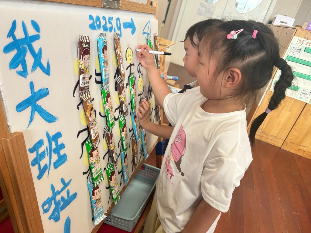 选好糖果后,孩子们来到对应的糖果小人签到板前,认真地进行心情签到。有的孩子在代表开心的区域画上可爱的笑脸,分享着开学的喜悦;有的孩子用稚嫩的笔触,表达着对新班级、新活动的好奇与期待;还有的孩子,悄悄在签到板上留下充满童趣的符号,诉说着自己复杂又真切的心情。