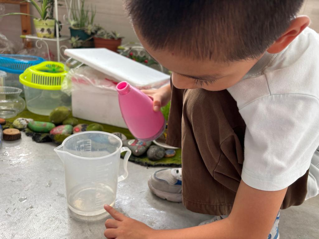《指南》中指出,科学领域中,5 - 6 岁幼儿“初步感知生活中数学的有用和有趣”,文乐使用量杯准确量取 50ml 水,并均匀分配到三个小盆中,这一行为表明幼儿能够理解量的概念,并进行简单的测量和分配操作,对数量关系有了一定的感知,符合该年龄段幼儿数学认知能力的发展要求。