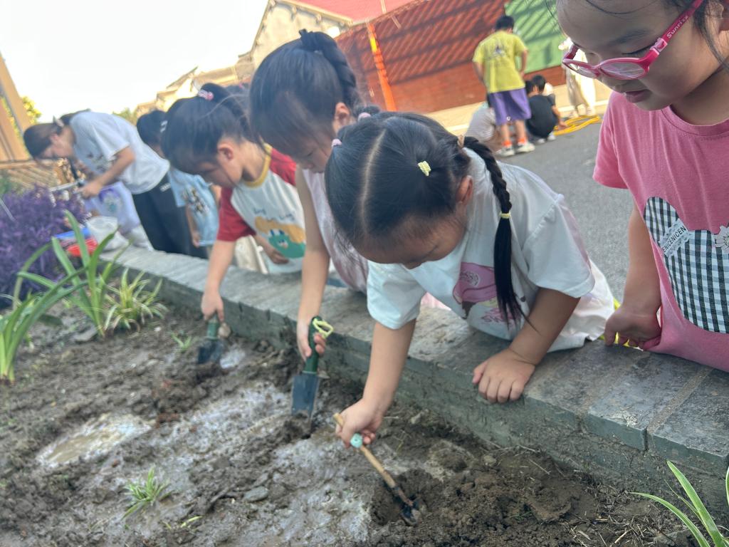 上午,我们通过图片和视频学习了醡浆草生长过程与种植方法,到了下午实际操作环节,老师将沈子涵与同伴分组并发放工具,她们来到小花坛指定区域开始种植。挖坑时,沈子涵起初用力过猛导致泥土飞溅,还差点挖到同伴区域,经同伴提醒 “子涵,你轻一点挖,不然土都跑走了,坑也不好看”,她放慢动作反复尝试,逐渐掌握技巧,挖出大小和深度适宜的坑,还高兴地和同伴分享 “你看,我现在挖的坑是不是和老师演示的一样啦”。挖好坑后撒营养肥料,老师叮嘱每个坑撒一小把即可,沈子涵起初抓的肥料过多,在同伴提醒后,她对比两人手中肥料量,将多余肥料放回袋子,再把适量肥料均匀撒进每个坑,撒完后还仔细检查确保用量一致。播种时,沈子涵小心翼翼拿出种子,认真辨认尖尖一端,先把种子放在坑中间确认方向正确,再用土轻轻覆盖仅露一点尖,虽起初多次弄倒种子,但她不气馁,在同伴帮助下最终按要求种好所有种子,兴奋地向老师展示 “老师,你看我把种子都种好啦,尖尖都朝上呢”。播种结束后,她用小铲子将土轻轻盖在种子上填平坑洼,还用手轻压土面让土壤与种子贴合,接着拿起小水壶浇水,刻意控制移动速度使水均匀渗透,发现有坑积水时,赶紧移开水壶对同伴说 “这里水太多了,种子会被淹到的,我们等它渗一渗再浇其她地方”。在接下来的一周里,沈子涵每天主动到小花坛观察,常蹲在种植区轻轻拨开土面查看种子情况,某天发现种子发芽后,她兴奋得跳起来,立刻跑去找同伴分享 “快来看,我的种子发芽啦!小小的芽好可爱”,还会根据土壤干湿情况向老师申请浇水,每次浇水都格外小心,生怕伤到刚发芽的小苗。