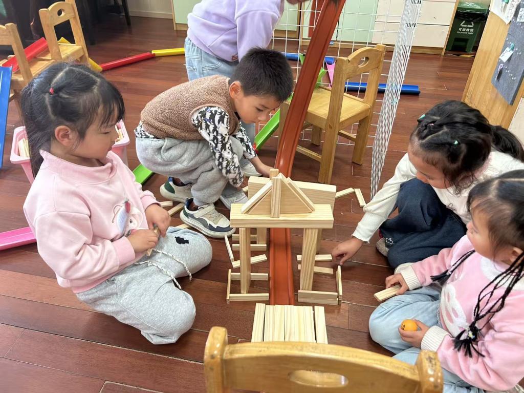 子涵、文博和子萌在建构区围绕轨道积木开展游戏,三人商议要在稳定的轨道段建造一座隧道。子涵先召集两人围在一起,指着轨道说:“我们得先选一块结实的区域,把隧道搭在这儿,这样小球经过时才不会塌。” 文博立刻回应:“那我们分工吧,我和子萌找三角形和长方形的积木搭隧道顶和支柱,你负责调整轨道和隧道的衔接处。”搭建过程中,隧道的支柱总是倾斜,子萌有些着急。子涵蹲下来仔细观察,对她说:“你看,下面的积木没对齐,我们换两块一样高的圆柱形积木当支柱,肯定能稳住。” 调整好支柱后,她又和文博一起将三角形积木搭在顶部,形成隧道的拱顶。这时,子涵发现隧道入口和轨道的衔接有点窄,小球可能会卡住,她马上找来一块稍宽的长方形积木,对文博说:“我们把这块加在入口处,把通道加宽一点。”隧道搭建完成后,子涵开心地拉着老师的手来到作品前,兴奋地介绍:“老师,你看我们的轨道隧道,小球从上面滚下来,会从隧道里穿过去呢!”