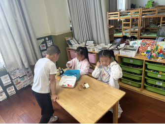 小搏来到骨外科,箖箖是骨外科的医生。小搏对箖箖说“医生,我手的骨头断了”,箖箖说“哪只手让我来看一看”,说完箖箖帮小搏卷起衣服,捏了捏她的手臂,随后拿着硬纸板放在小搏的手臂上,然后用橡皮筋八手臂和纸板固定住,接着又剪了一段绷带,他把绷带在手臂上饶了一圈,再绕过脖子,正想打结,箖箖说“哎呀,太短了,系不上”。于是他又剪了一段长一点的,这回够了,可是他又停了下来“怎么打结呀”他请边上的小朋友帮忙才搭好了结。箖箖说“好了,你可以走了”,小搏谢过医生就离开了。过了一会小搏来找到我“老师,我这个什么时候能取下来,一直绑着我都不能游戏了。”幼儿知道骨头断了需要固定和绑好绷带,能够利用已有的材料进行一些相应的处理,但是经验比较缺乏,对具体的操作步骤还不明确。在给病人系绷带的过程中出现了问题,第一次没有估算好长度,第二次是不会打结,但是通过尝试和请同伴帮忙还是顺利地解决了问题,就是耽误了游戏的时间。处理好骨折后,医生没有对病人交代后期的注意事项,导致病人离开医院后一直绑着无法游戏。下次游戏可以请医生和病人分别说说遇到的问题,大家商讨解决方法,如不会打结怎么办,可以在区域活动中练习,或是提供一些夹子夹绷带等。观看骨科医生处理骨折的视频,知道大致流程如:拍X光照-服药-包扎-固定-修养-拆线等。和幼儿讨论骨外科除了处理骨折,还能处理哪些伤,丰富游戏情景。同时根据幼儿的游戏逐步丰富游戏材料。